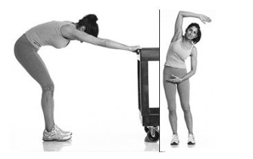 Then stand up straight and, with the support of your hands, bend your body to each side as illustrated in the picture on the right.