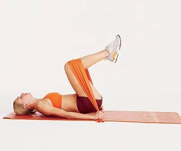 Lehněte si na záda s pokrčenými koleny. Ruce mějte položené dolů na podložce držíc konce elastické pásky. Pásku si přehoďte přes vrchní část lýtek pod koleny.