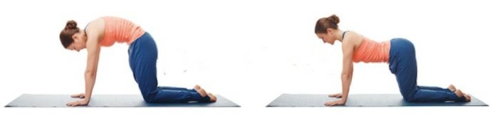 Now inhale and arch your back upward like an angry cat. Hold briefly, then exhale as your chest drops down into the opposite back bend.