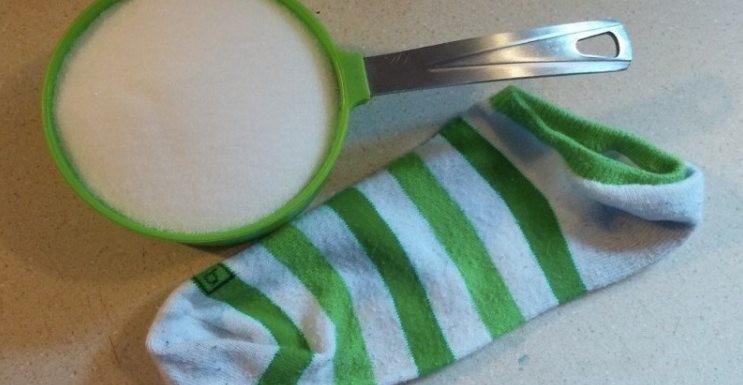 To start, pour the salt into the sock and close it securely – either with a knot at the top of the sock or using a clip or elastic band.
