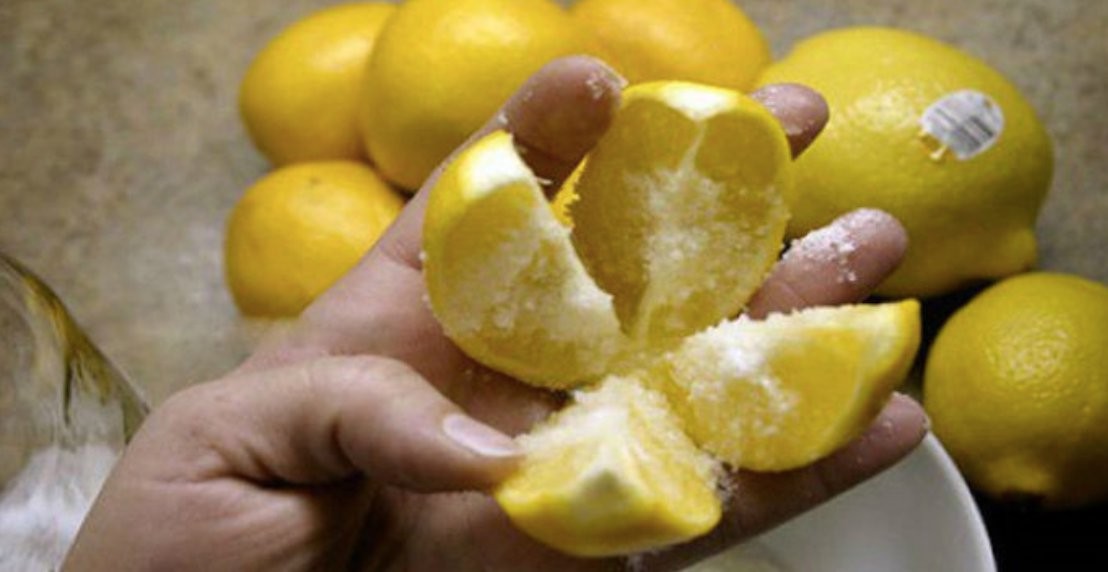 First take a lemon and cut it preferably into quarters. Be careful not to cut it all the way through; it’s good if it still holds together.