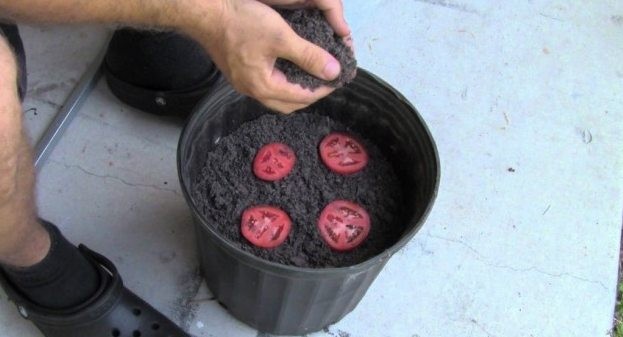 All you need to do is slice the tomatoes into rounds, place them on the soil in a flowerpot and then cover them again with a continuous layer of soil.