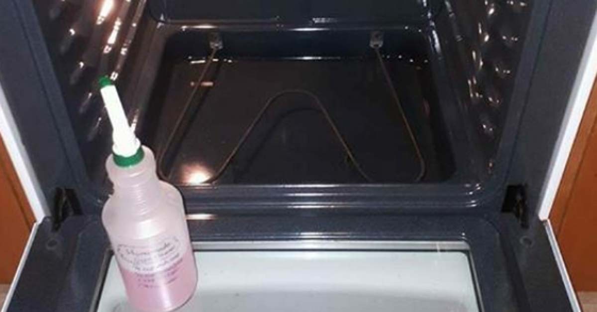 Mix the ingredients and pour into a spray bottle. Spray the entire interior of the oven with the liquid. Let the solution sit for half an hour. After this time has passed, wipe the interior with a cloth and admire how quickly and easily the dirt and grease come off.
