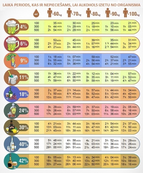 Do you like wine? Classic wine has about 18% alcohol. When consuming 300 ml you need, depending on weight, 7 hours and 50 minutes (60 kg), 6 hours and 43 minutes (70 kg), 5 hours and 52 minutes (80 kg), 5 hours and 13 minutes (90 kg) or 4 hours and 42 minutes (100 kg). As you can see, it’s not a matter of minutes, so you shouldn’t sit behind the wheel for quite a long time after a night of revelry. If you like to drink stronger spirits like rum or slivovitz, you can have alcohol in your system even 15 hours after consumption (when consuming 300 ml).