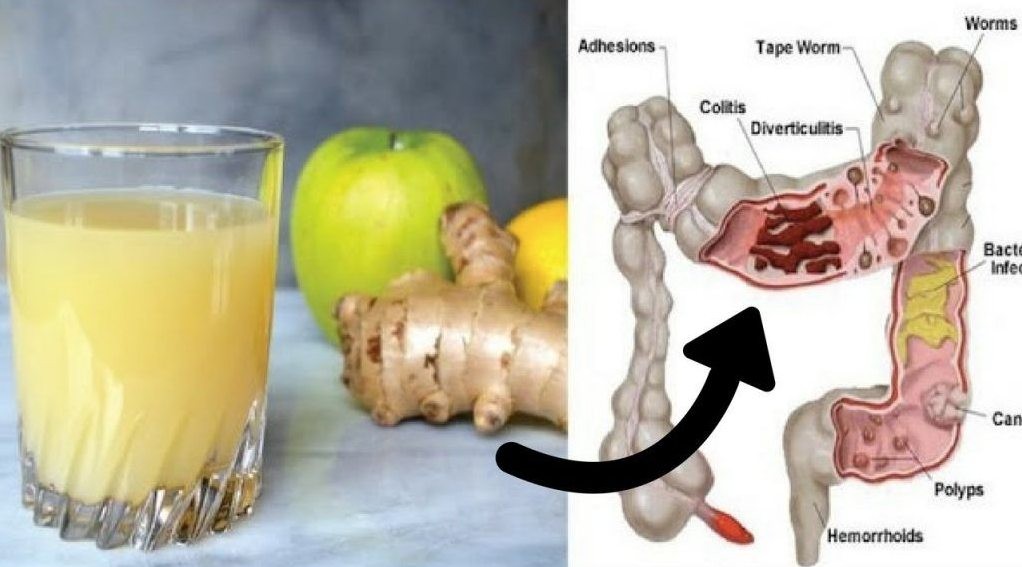 It contains apples and ginger, which address a number of digestive problems and keep the large intestine clean. The juice also contains lemon juice, which speeds up digestion, detoxifies the body and contains vitamin C, which is a powerful antioxidant that can cleanse your body.