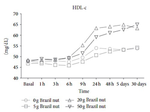 Test volunteers were given doses of 0, 5, 20 and 50 grams of Brazil nuts (approximately 0, 1, 4 and 10 nuts) and then their bad LDL and good HDL cholesterol levels were measured at various time intervals.