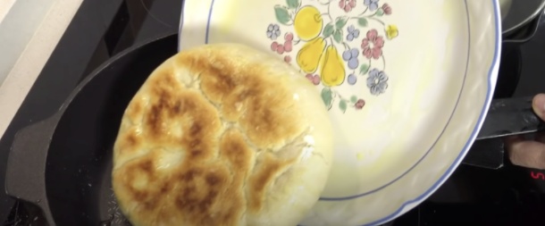 - Place one of the loaves on the greased pan and cover with a lid. Cook the bread over medium heat on one side for 12-15 minutes, until the bottom turns golden.