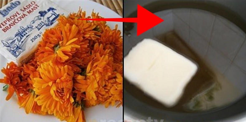 • Put pork lard on the heat and let it melt; when the fat starts to shimmer, mix in the calendula flowers – the proportion is 500 g of lard to 1 handful of herbs.
