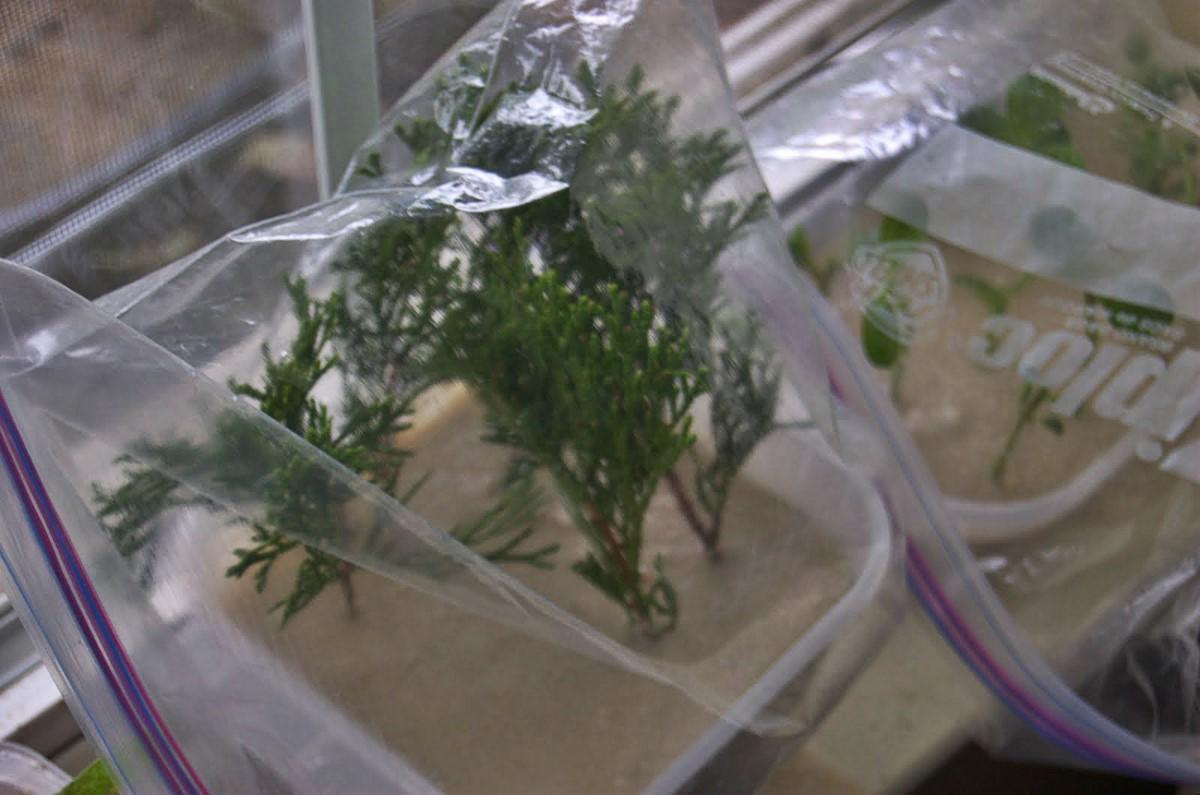 Treating with rooting hormone: The cutting must be treated with rooting hormone before planting. A product called Incit is available in garden stores. Moisten the thuja branch, dip it into the rooting hormone powder, and gently shake off the excess.