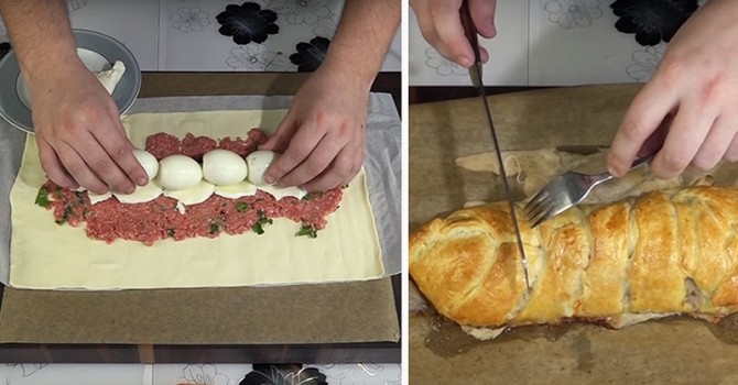 Now prepare the puff pastry. Roll it out on baking paper and spread half of the minced meat in the center. On it place five slices of cheese and four hard-boiled eggs, which you cover with another layer of cheese. From the remaining minced meat make several smaller patties and cover the prepared filling with them. The entire filling must be hidden under the meat. Make 6 diagonal cuts on each side of the dough and fold them over each other like a braid. Brush the pie with beaten egg. Bake in the oven at 180 degrees for 30 minutes. Enjoy your meal!