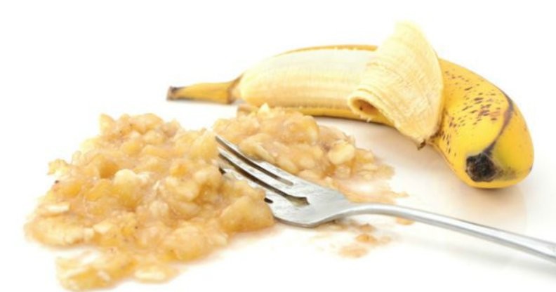 Start by peeling two well-ripe bananas and mashing them in a bowl with a fork.