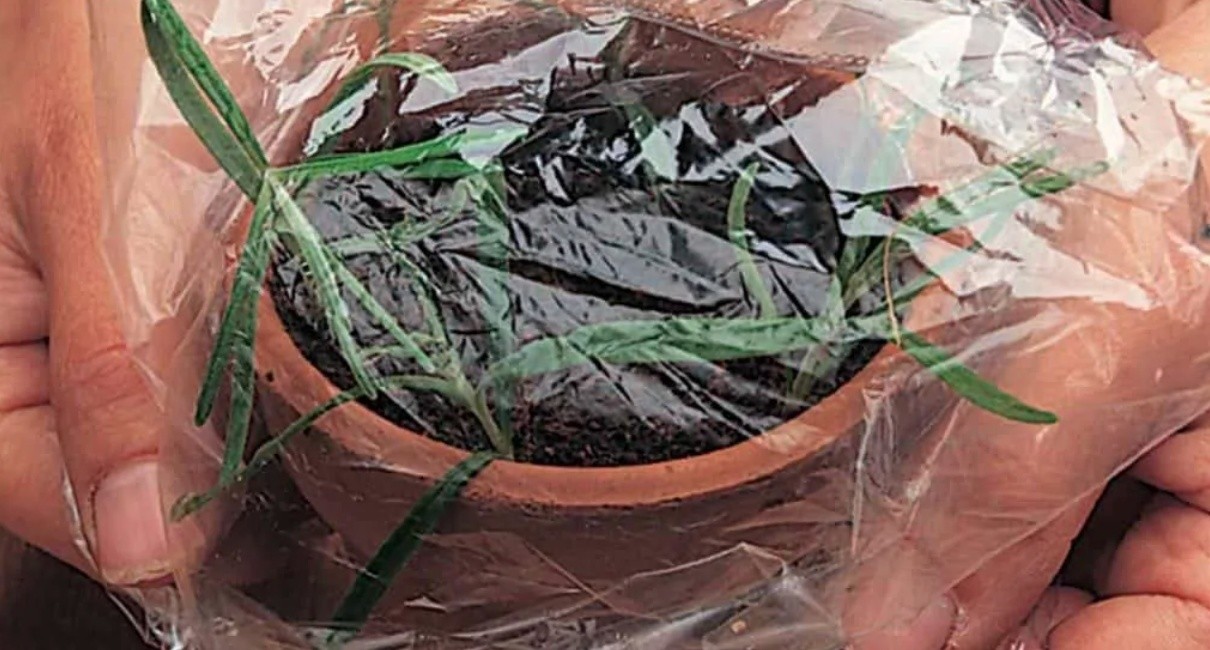 Water the soil thoroughly and then cover the pot with a plastic bag, which will help maintain a humid environment around the cuttings.