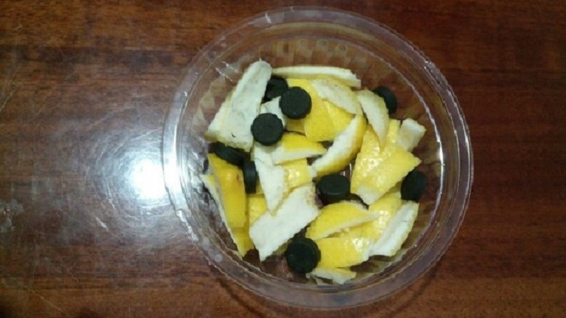 To make it you only need things you can find at home. First, you will need a plastic bowl. If you don’t have one, use a plastic water bottle and make several holes in it with a heated skewer. Put grated zest from a lemon into the bowl. You can lightly rinse the zest with water before grating. Then add activated charcoal, or charcoal. The kind you use for grilling is sufficient. To make the absorber last longer, you can cover the bowl with a lid, but so that air can get in. The same applies to the bottle. Aluminum foil pierced with holes will do. And the absorber is ready.