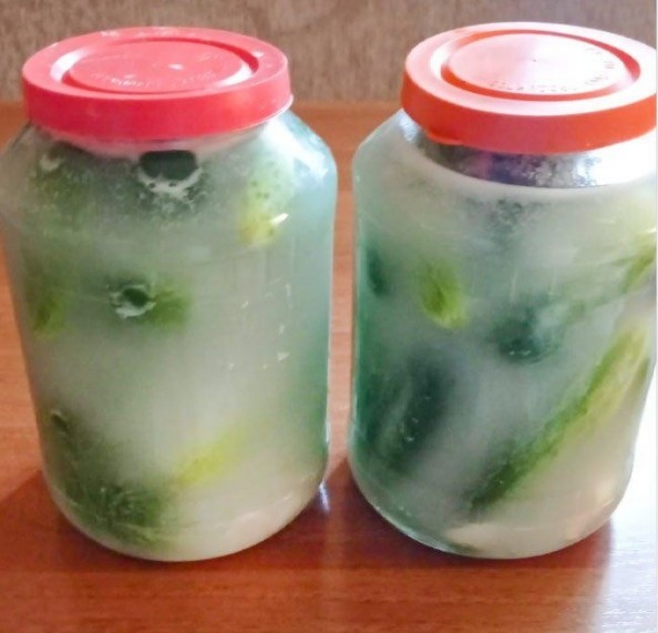 Put horseradish, a leaf, and the cucumbers at the bottom of the jars. Pack them in nicely, then sprinkle three tablespoons of salt and flour. Fill with drinking water, preferably rainwater or rested water. Cover the jars with lids and leave them on a tray, because they may leak through the lid. Let the cucumbers sit for 3-4 days and turn them every day so that the flour is distributed throughout the jar.