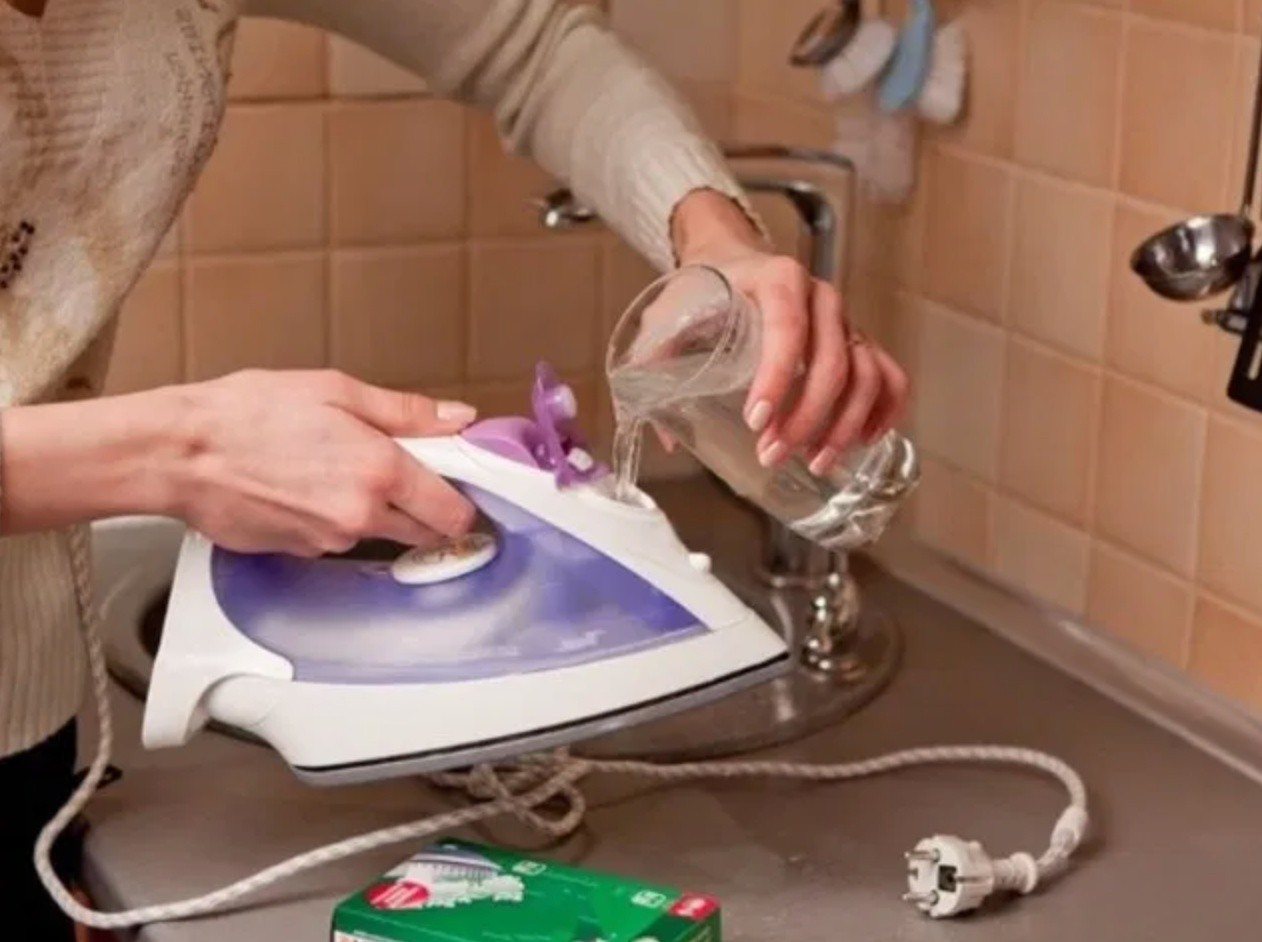 Mix vinegar and water in a bowl in a 1:1 ratio. Place the iron vertically, pour the solution up to the fill line, heat the iron to the maximum and leave it for 10 minutes.