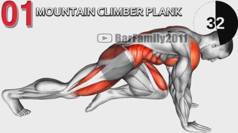 From the plank position, bring the knee of one and then the other leg alternately toward the opposite hand, keeping the abdominal muscles engaged the whole time, arms extended and remember to breathe regularly.