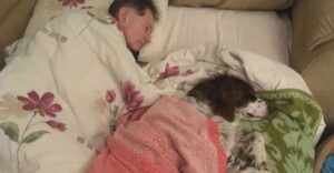 The little dog is too old and sick to sleep on the second floor. The family takes turns every night and sleeps with him on the couch so he feels better