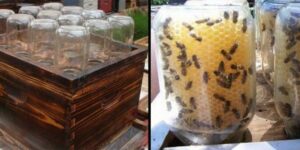 The old man built beehives at home in his garden and harvests his own honey. All you need for that is just a canning jar.