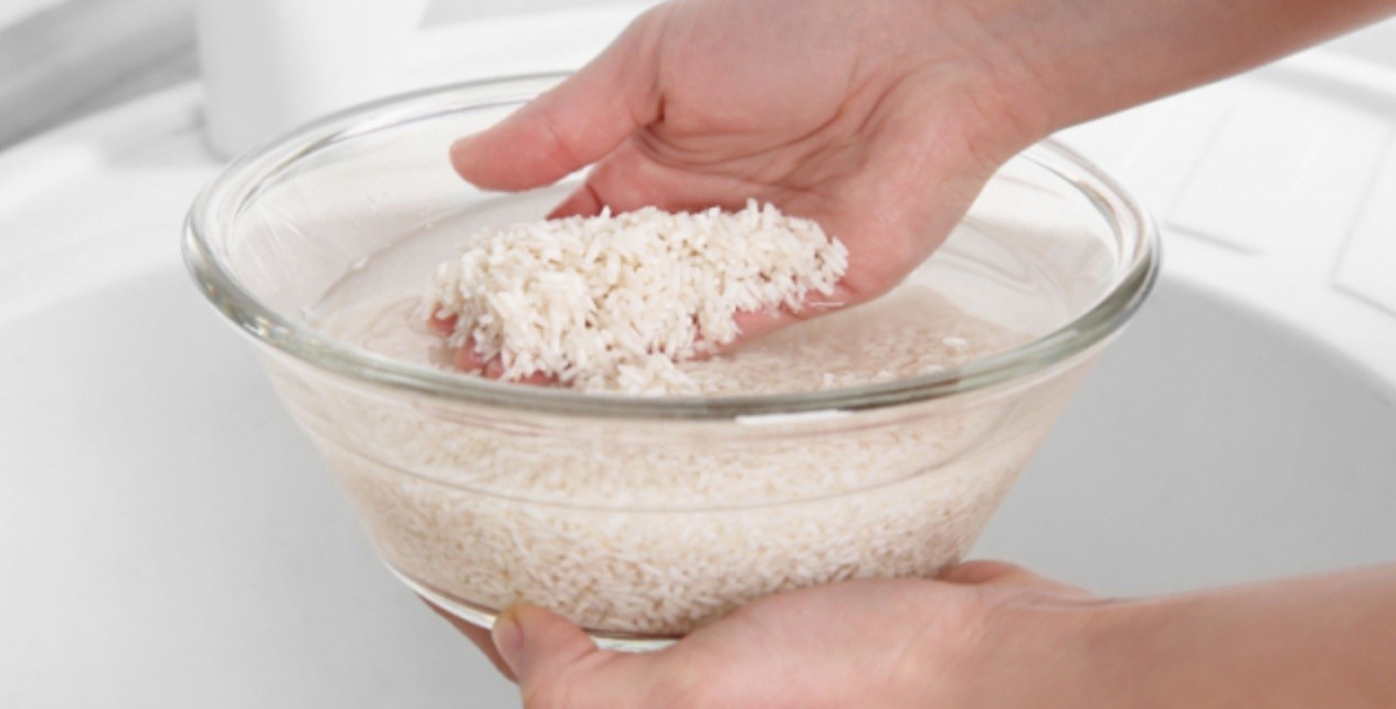 First rinse the rice with 1 cup of water to remove impurities. Then transfer the rice to a bowl and pour water over it. Stir with your hands so the water circulates (this helps vitamins and minerals release into the water faster) and let it sit for 10–15 minutes.