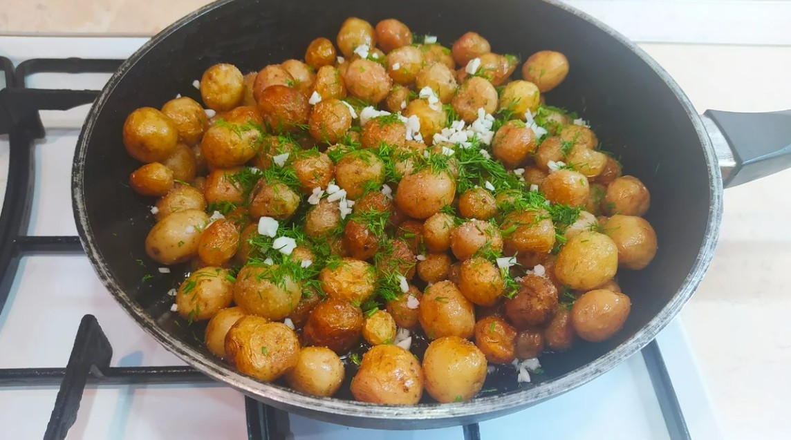 Then remove the lid, increase the heat, and fry the potatoes on all sides until golden. The potatoes must be fried very quickly, for 4-5 minutes. The finished potatoes only need to be salted, sprinkled with finely chopped dill, and don’t forget to add the garlic. The aroma of potatoes prepared this way is absolutely perfect.