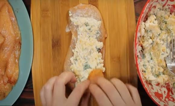 Cut the breasts into thin slices. Cover them with plastic wrap and pound them with a meat mallet. Just gently. The breasts will be thinner and easier to handle. Now we will fill them. Place them on a board and fill them with the mixture using a fork or spoon. You can secure them with toothpicks or string. But don’t forget to remove them before eating!