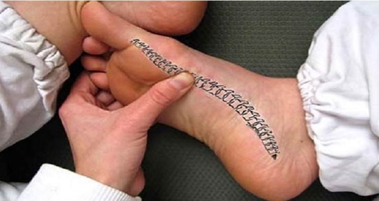 First you need to find the “spine” on the foot. Sit on the floor cross-legged and take one of your feet in your hands. The line between the heel and the big toe on the inner side represents the spine.