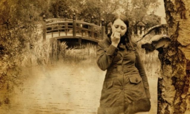 To see the second person in the photograph, you need to look at it from a distance or reduce its size. You will immediately notice that the bent tree forms an oval face, the bridge together with the mushroom on the tree depict the eyes, the girl’s silhouette becomes a nose and the bottom of her dress creates the lips