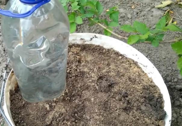 Vezměte 2-litrovou plastovou láhev. Naplňte ji vodou a důkladně ji uzavřete tak, aby do ní nevnikl žádný vzduch. Usnadní to vytváření malých otvorů pomocí jehly. Vzhledem k tomu, že láhev je nainstalována na okraji kbelíku a osivo / rostlina je vysazena v jejím středu, otvory by měly být na čelní straně láhve, která já orientovaná směrem k semínkům / rostlinkám, asi 3 – 4 cm od spodku láhve a ve vzdálenosti 2,5 – 3 cm od sebe, na stejné úrovni.