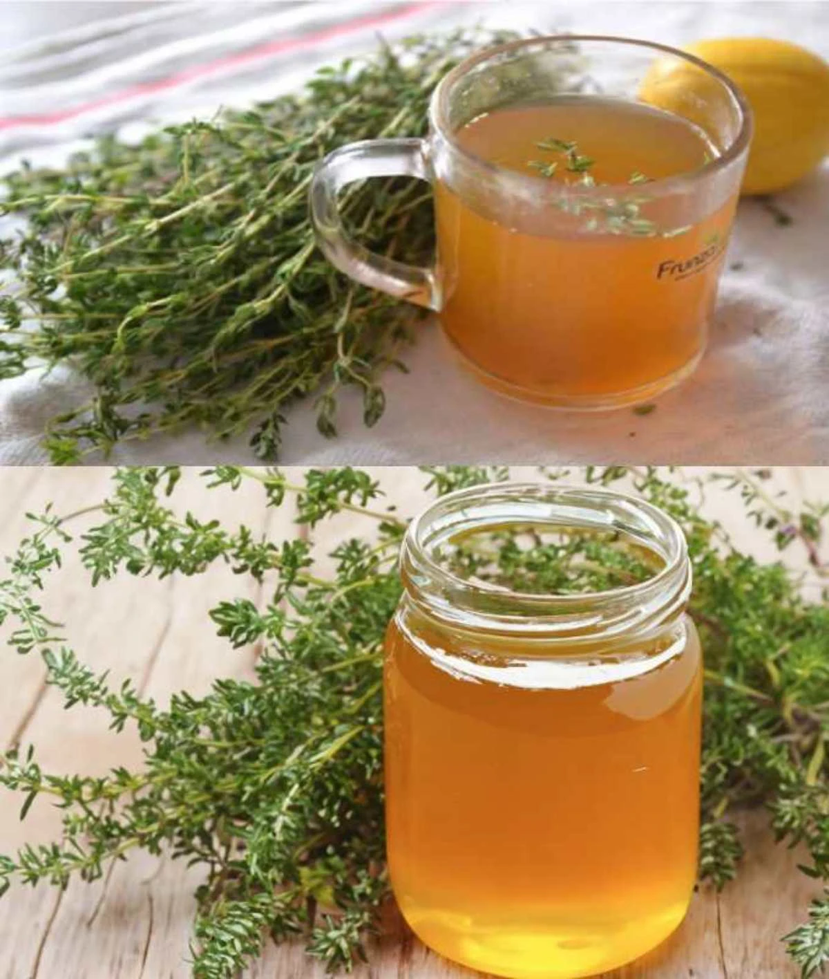 - Preparation of the tea: chop the thyme and put it in a pot. Add water, bring to a boil and simmer until the liquid has reduced by half.