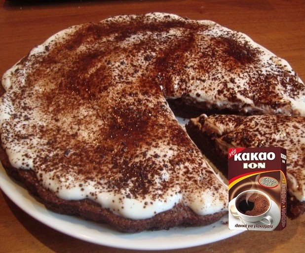 Remove the baked cake from the oven, and while still warm take it out of the pan. Now spread it with sour cream mixed with a little sugar and sprinkle with cocoa. You can also use any other cream, jam, condensed milk, chocolate, caramel and so on. The top can be sprinkled with nuts, grated coconut, candied fruit, stewed fruit and more. After decorating, put the cake to set in the refrigerator.