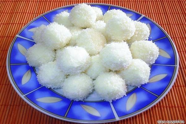 Other ingredients are one tablespoon of butter, 1 package of vanilla sugar, 30–40 almonds. Preparation will be simple. Mix the milk with the cream and the grated coconut, sugar and vanilla sugar. The dough should gradually separate from the sides of the bowl. Then form balls and put half an almond into each of them. Then roll the balls in coconut flakes and you can serve. Make more of them, because they are very popular and will disappear quickly from the table.