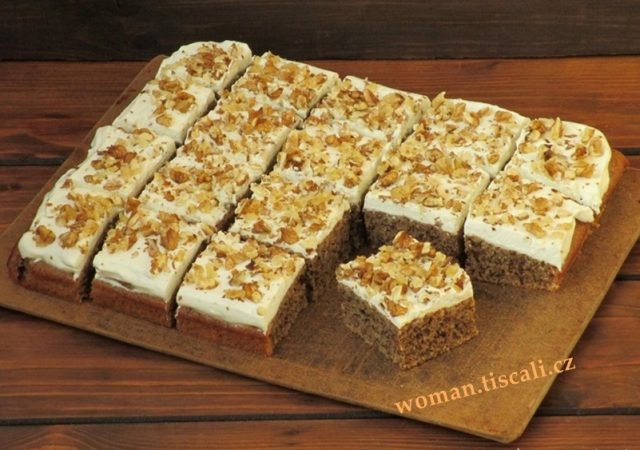 - Cream preparation and decorating: Whip the cream with the powdered sugar until stiff. After the cake has cooled, spread the cream over the surface. Finally, sprinkle with chopped walnuts.