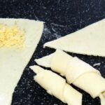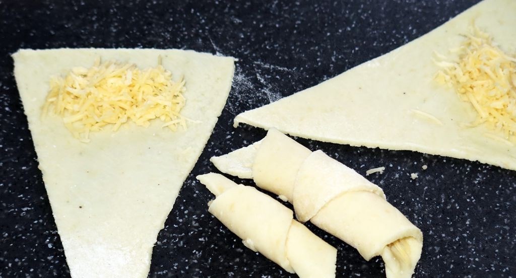 - Then cut it into even triangles, similar to a pizza. Sprinkle a little grated hard cheese on the end of each piece. Then roll up the slice of potato dough.