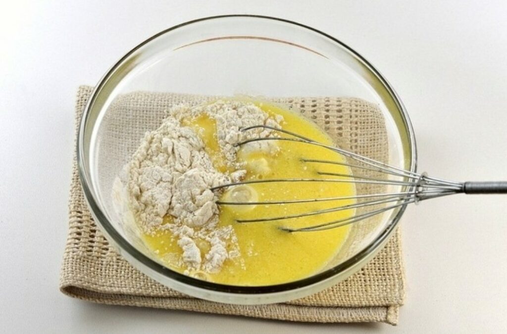 - Whisk 2 eggs with the sugar until foamy.