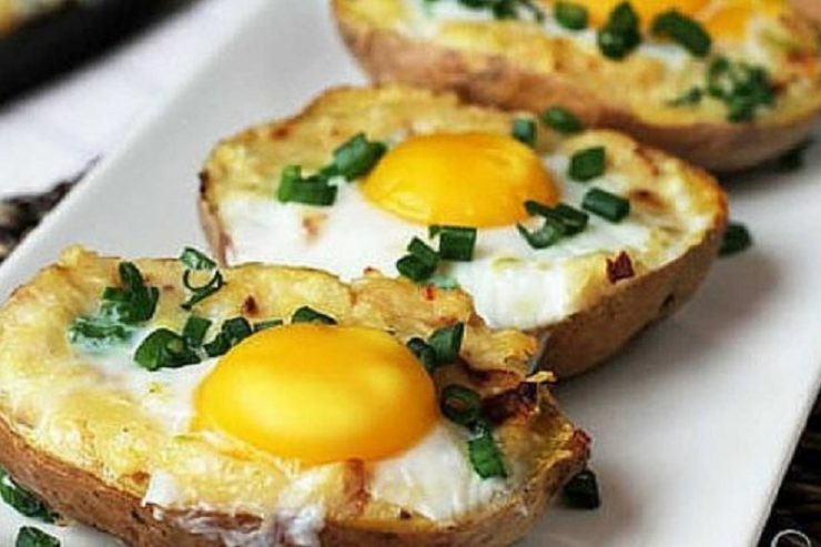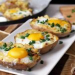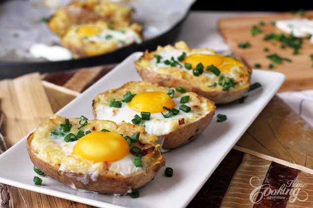 Baked potatoes filled with a mixture of cheese, garlic and onion with an egg on top