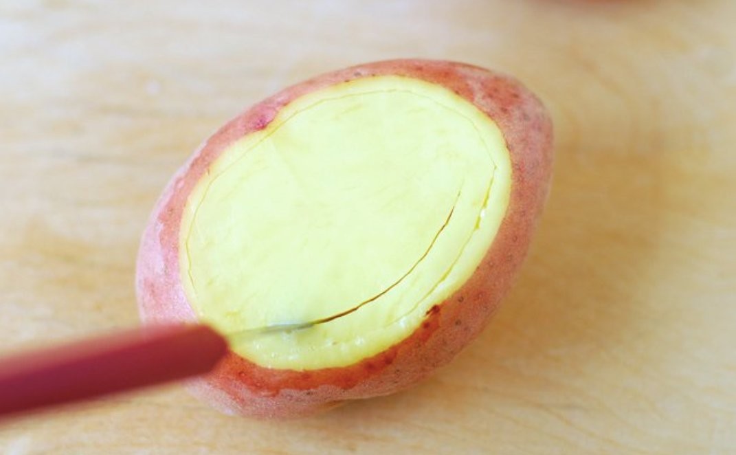 • Score the edges of the potatoes with a knife, but leave a small uncut circle at the bottom. You can measure it, for example, with your thumb. If the cuts are not deep enough, adjust them before continuing.