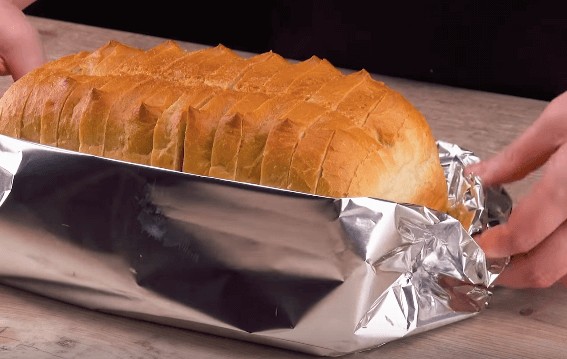 - Place the bread on a sheet of foil and fold the ends of the foil so that we create a sort of makeshift bowl.