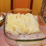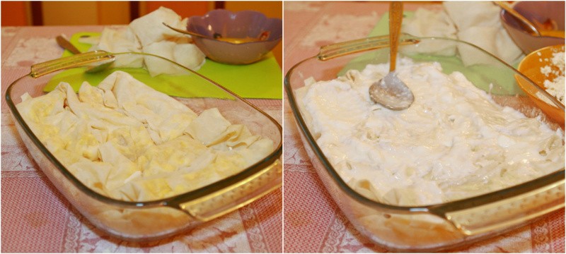 We brush that with butter. On the dough we put a layer of cheese and on top again a layer of dough, which we again brush with butter. - We can roll the dough or just layer it and cut it into squares so the dish is easier to serve.