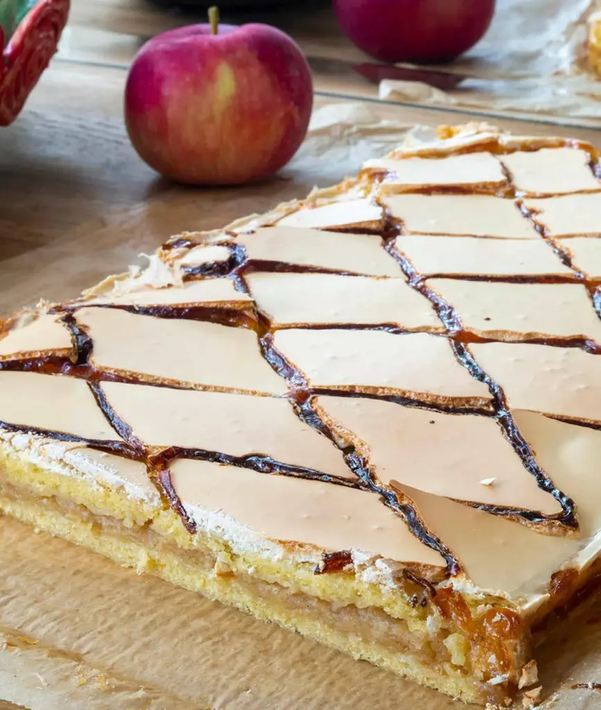 The charlotte is one of the most popular apple desserts, but this recipe brings an unexpected flavor pairing that gives it a new dimension. The combination of peach jam, a delicate apple filling and a light sugar glaze creates a cake that is tender, juicy and beautifully balanced in sweetness. Thanks to the semi-firm dough it holds its shape, yet it pleasantly melts in the mouth.