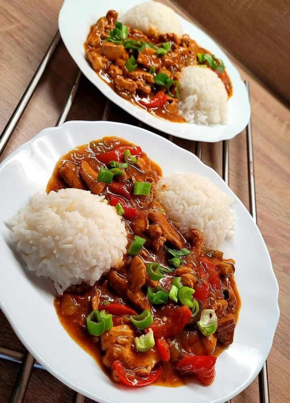 • Serving: Serve a portion of rice on a plate with the chicken mix beside it. Serve immediately, ideally garnished with fresh herbs or spring onions.