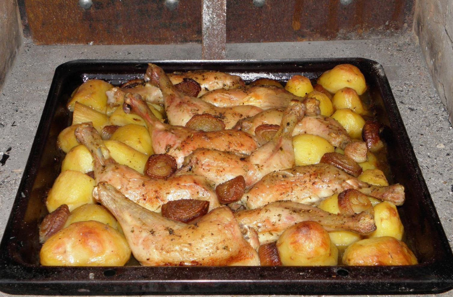 Does the chicken have a perfect crust? It’s time to serve it. On the plate put one chicken thigh and next to it a combination of roasted potatoes and onions. Lightly drizzle with the pan juices and white wine, and you can taste it.