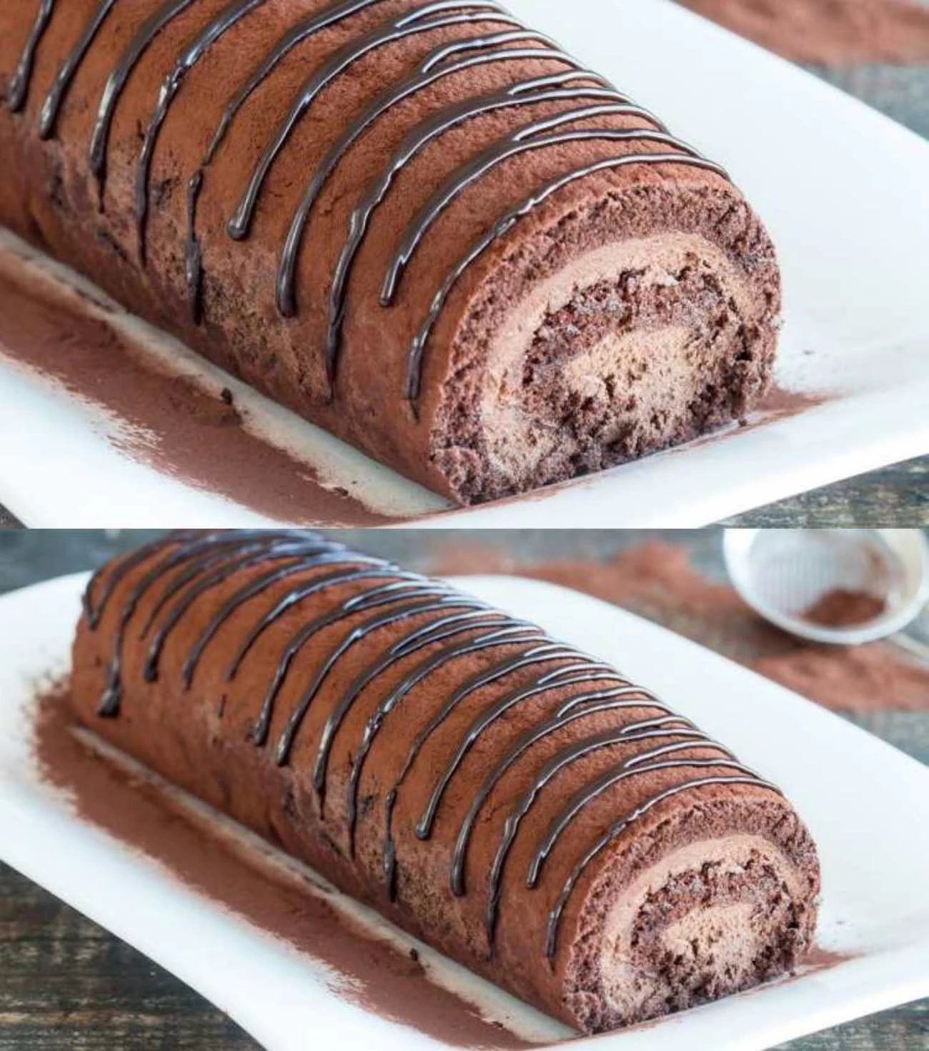 • Finishing Dust the roll with cocoa. Make a quick glaze from 30 g chocolate and 30 g cream (in a bain-marie), pour over or decorate with strips.