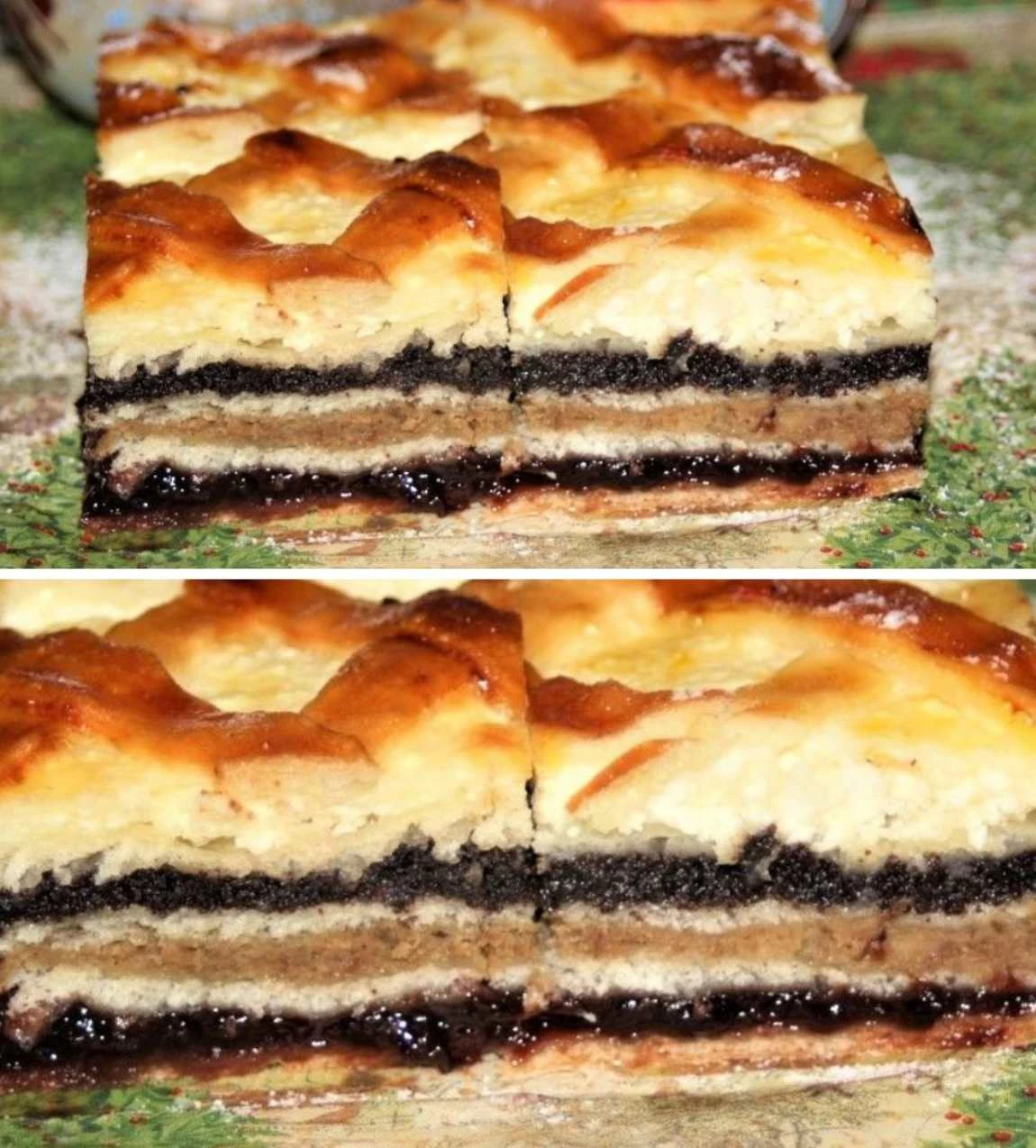 • Layering the dough and fillings Divide the risen dough into 5 equal parts. Roll each part out to the size of the baking tray (30 × 40 cm). Place the first sheet of dough on the greased tray and spread with the plum filling. Cover with the second sheet, press lightly and spread the nut filling. Add the third sheet and spread the poppy seed filling. Put the quark filling on the fourth sheet and smooth it. Cut strips from the fifth sheet and create a lattice. Brush with the beaten egg.