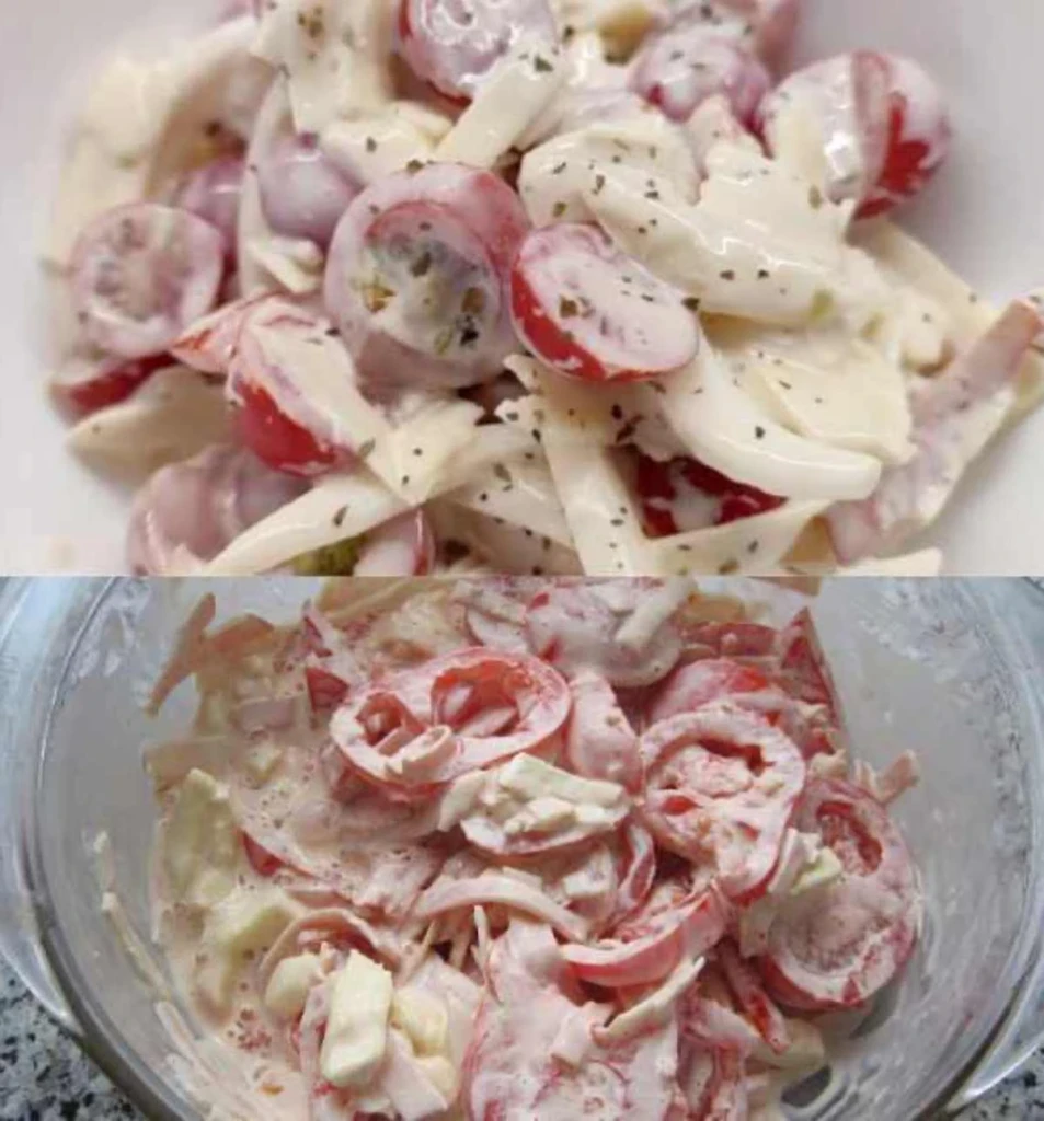This cold tomato, onion and cheese salad is a great quick summer dish that combines fresh vegetables with cheesy flavor and a creamy dressing. Thanks to the short preparation and chilling, you’ll have a refreshing dish in no time that will please the whole family and guests.