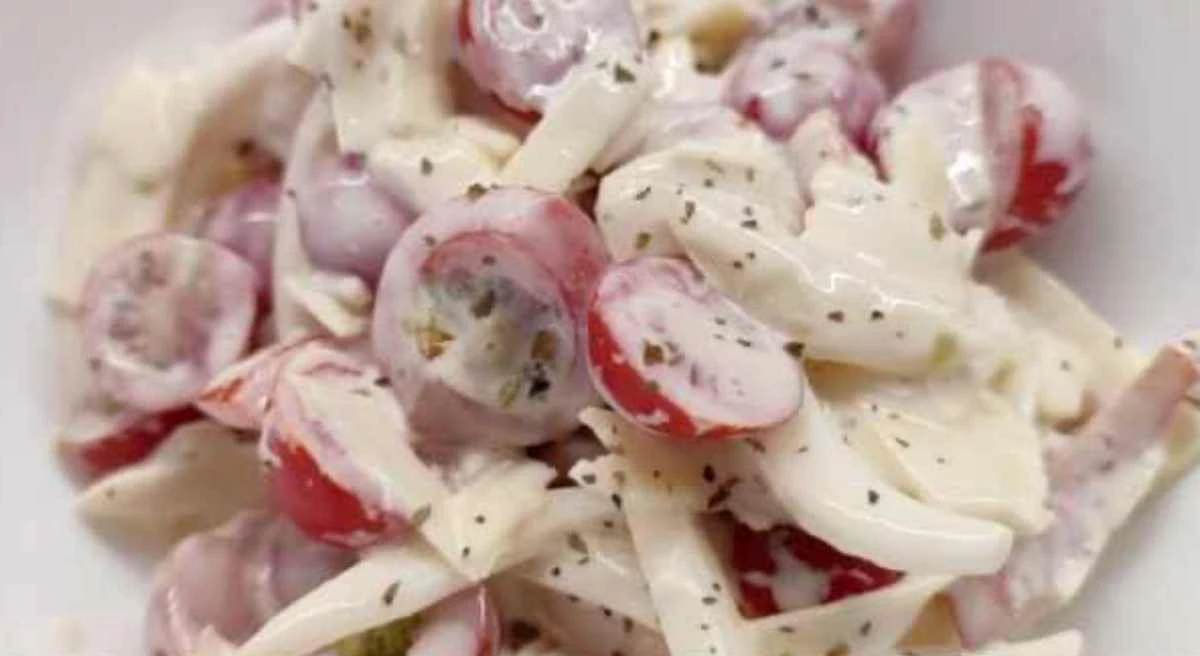 This cold tomato, onion and cheese salad is a great quick summer dish that combines fresh vegetables with cheesy flavor and a creamy dressing. Thanks to the short preparation and chilling, you’ll have a refreshing dish in no time that will please the whole family and guests.