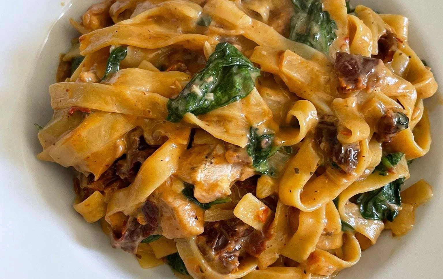 This recipe for creamy pasta with chicken, sun-dried tomatoes and spinach is a great choice for a quick and tasty dinner. Thanks to the combination of a creamy sauce, chicken and vegetables, you get a hearty and balanced dish that will please everyone. Additionally, the one-pan preparation makes cleanup easier and saves time.