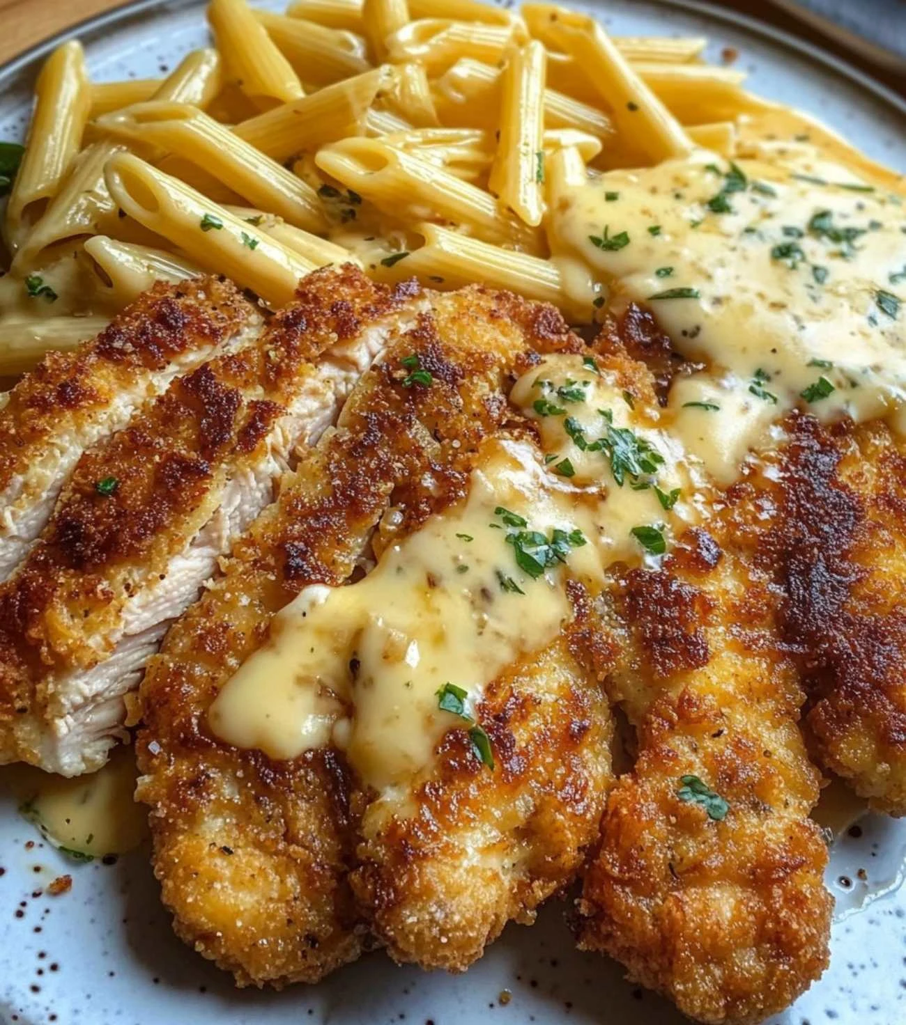 Crispy chicken cutlets with garlic-cheese sauce and buttery pasta