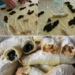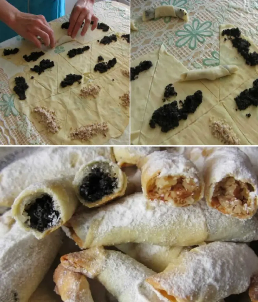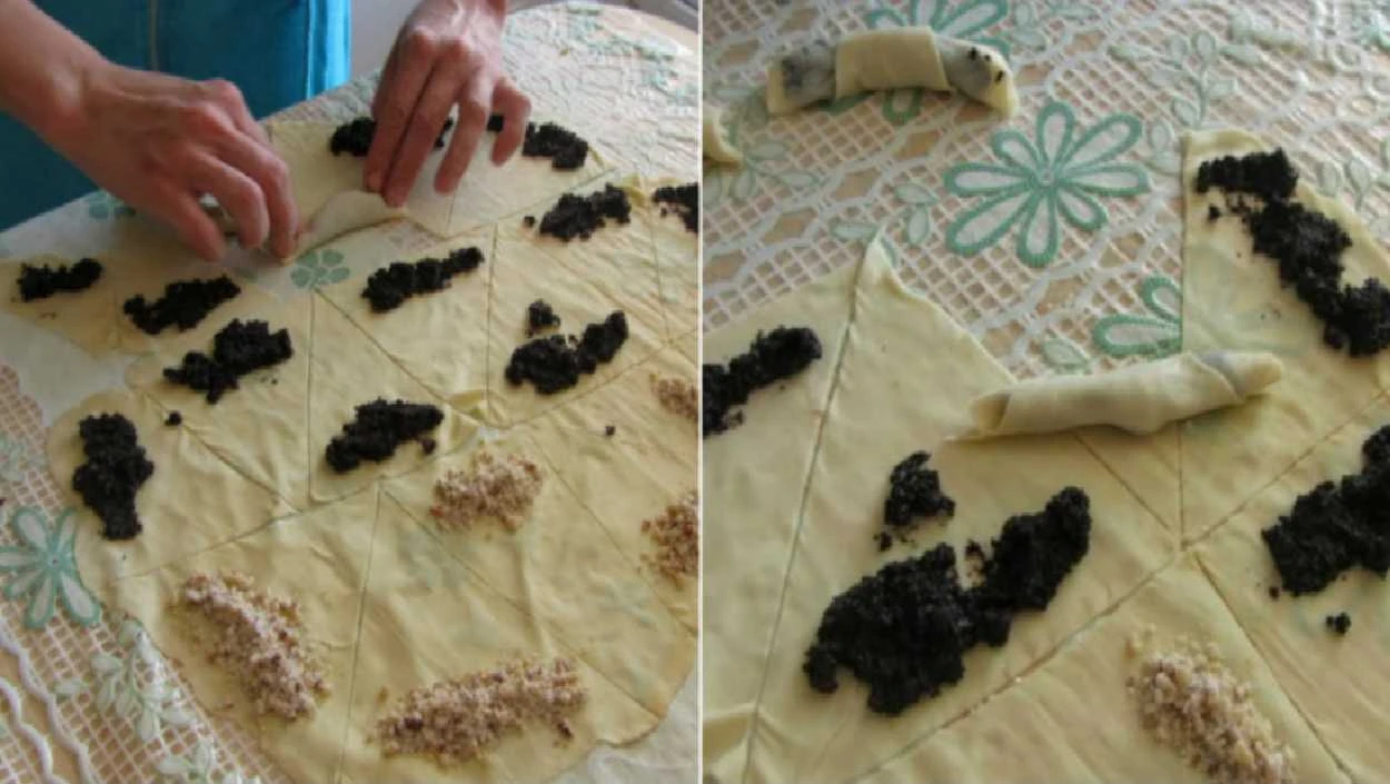 • Preparing the fillings Poppy seed: pour hot water over the ground poppy seeds, let steep for 10 min, then sweeten with sugar. Walnut: mix the ground walnuts with sugar.