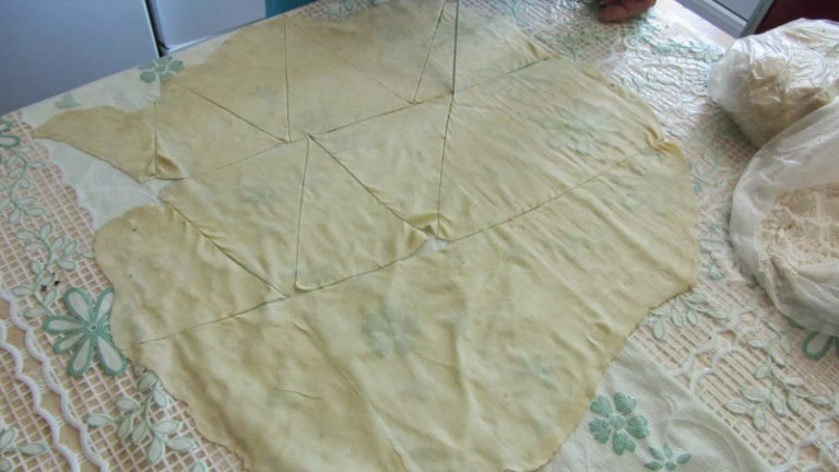 • Shaping the rolls Roll out the dough to a thickness of approx. 1 mm, cut into triangles. On the wider side of each triangle place a teaspoon of filling and roll toward the tip.