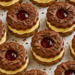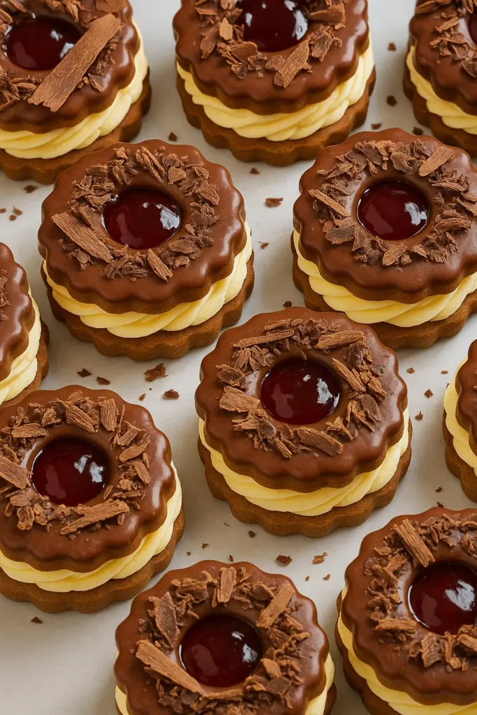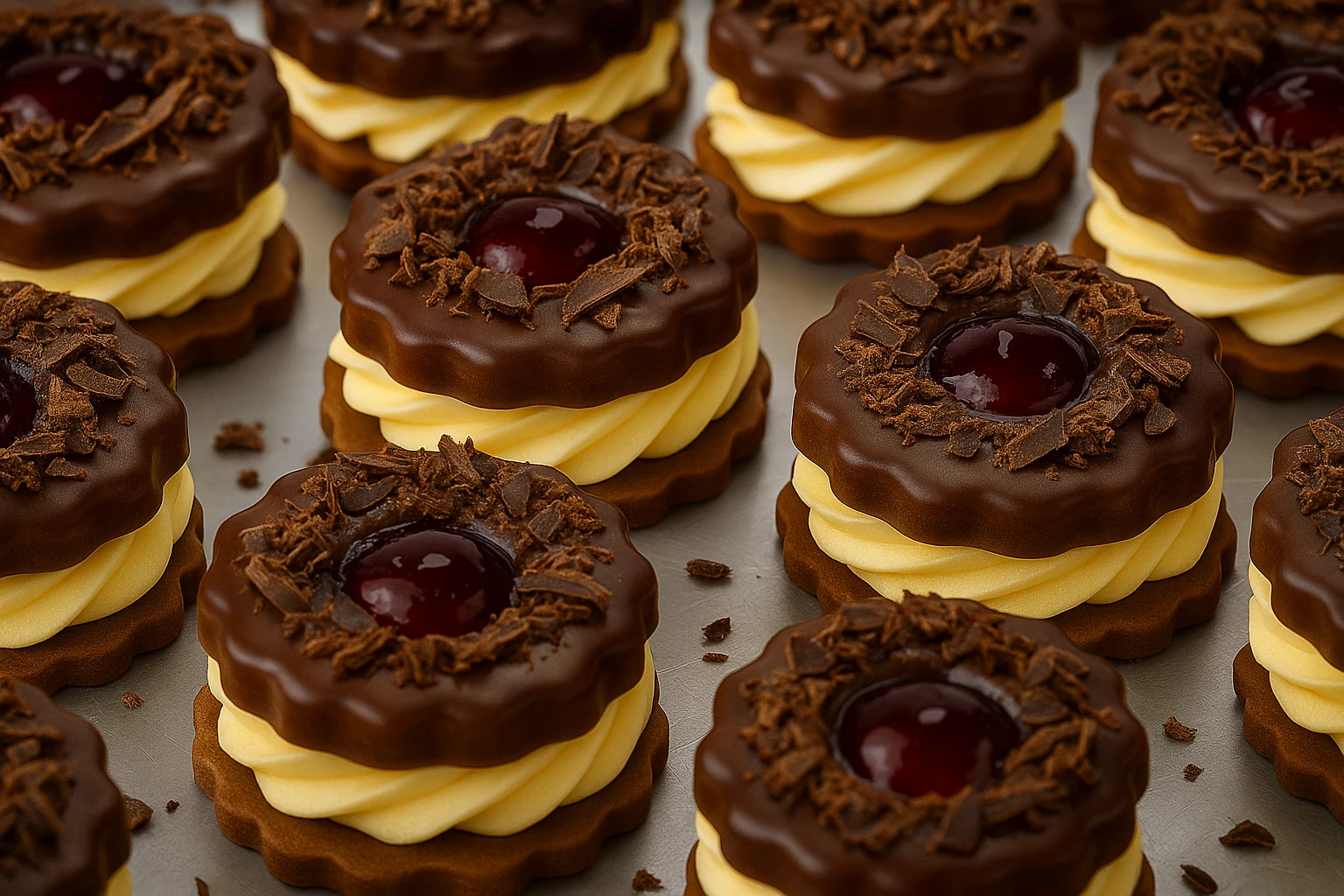 This mini version of Black Forest cake is the ideal dessert for anyone who loves elegance and bold flavors. The combination of a delicate cocoa base, rich white chocolate and distinctive cherry jam creates a pairing that never disappoints. The rounds look great, keep well and are a perfect idea for a festive table or Christmas cookies.